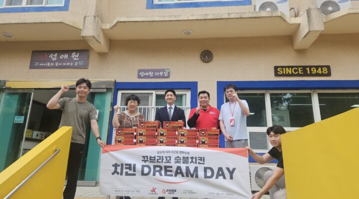꾸브라꼬숯불치킨의 8월 나눔행사 ‘치킨 드림데이’, 부산 성애원서 진행 치킨브랜드 꾸브라꼬숯불치킨 운영사인 ㈜외식전문기업JK(대표 김태훈, 전민호)이 나눔행사 ‘치킨 드림데이(DREAM DAY)’의 이달 행사를 통해 치킨을 나누며 사랑을 전했다. ‘치킨 드림데이’는